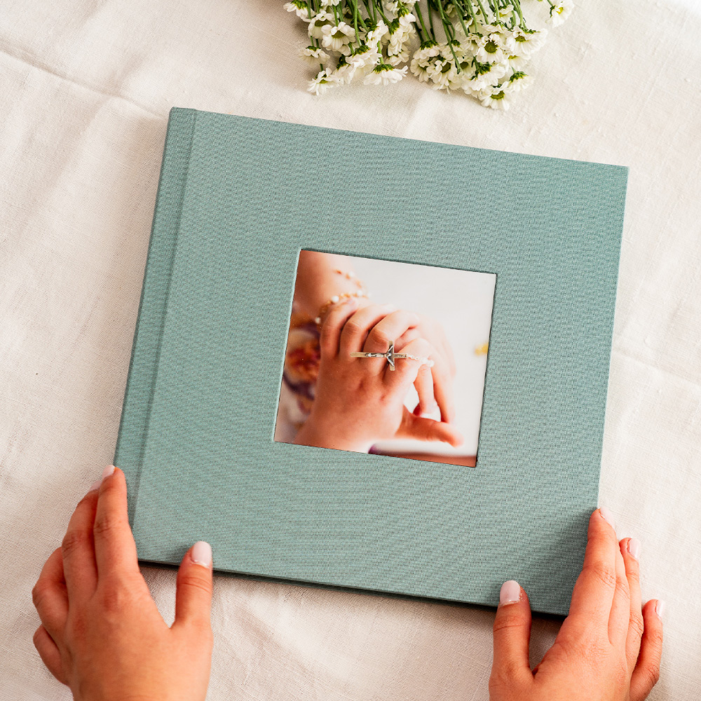 Os Álbuns Analógicos em Linho com janela possuem generosas dimensões de 30x31cm, proporcionando um espaço amplo para organizar e preservar as tuas memórias de forma elegante e sofisticada.