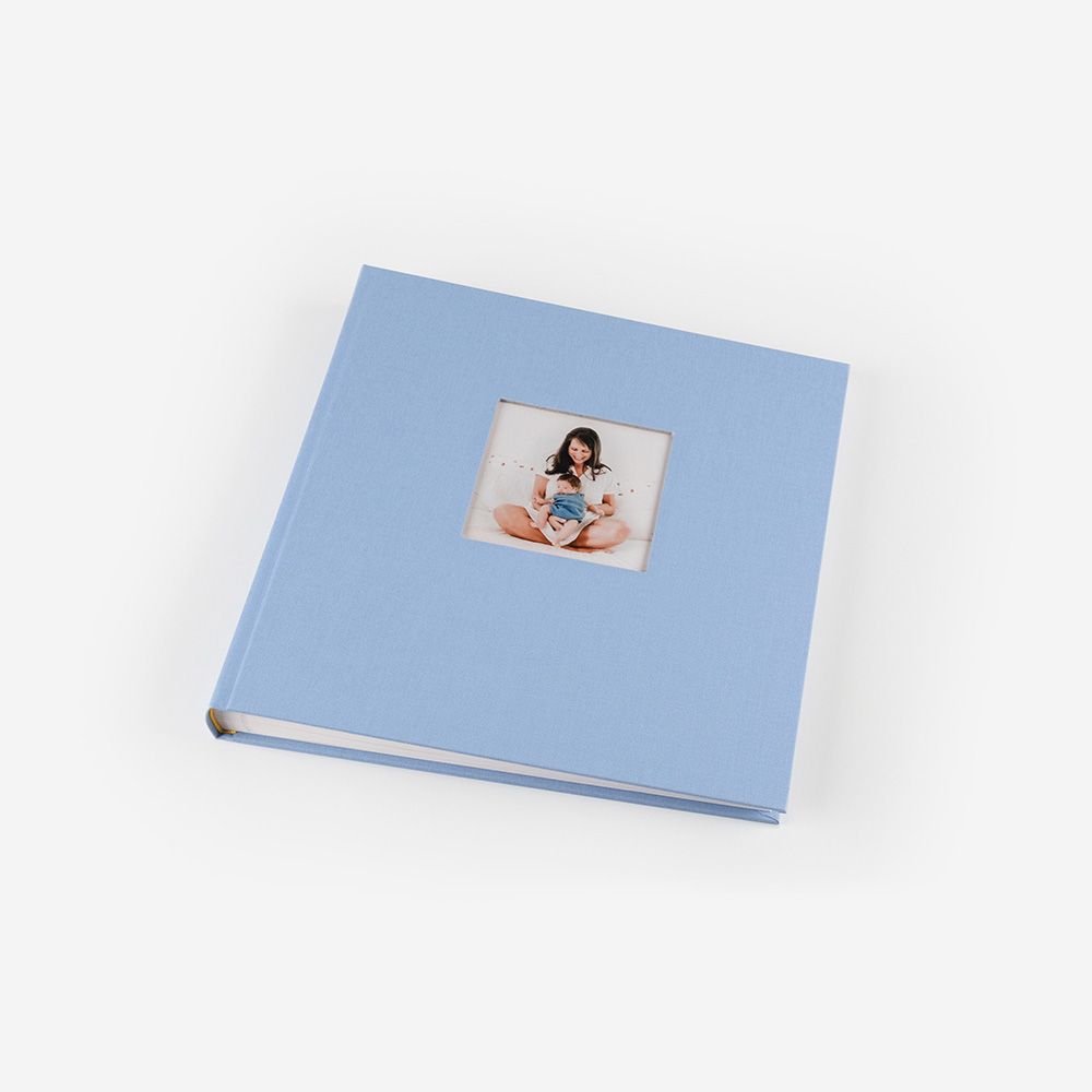 A capa em Linho dos Álbuns Analógicos com janela apresenta uma abertura para destacar uma fotografia de 10x15cm. Disponível em sete cores: azul, bege, cinza, rosa, castanho, mostarda e verde.
