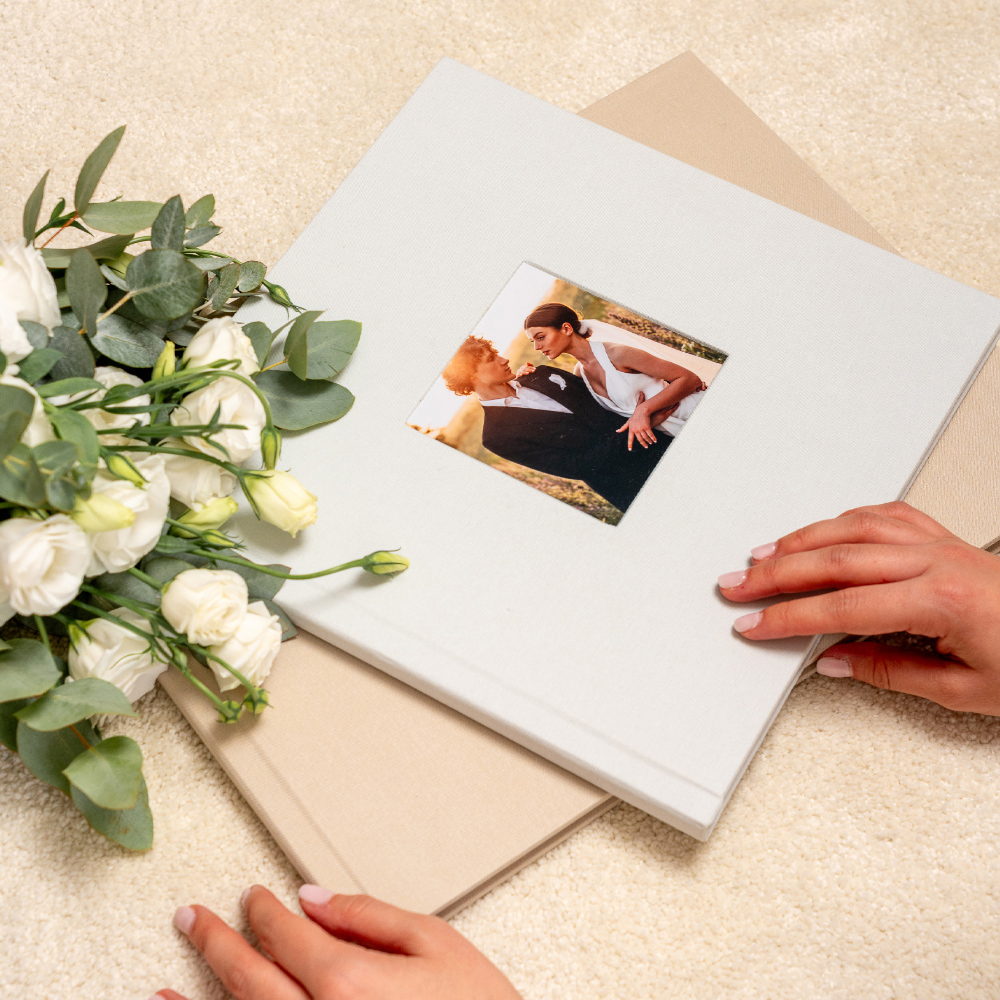A janela do modelo Cameo é mais do que um detalhe, é uma declaração. A fotografia de 11 x 11 cm é impressa e cuidadosamente embutida na capa, fazendo parte da sua estrutura. Não é um encaixe para troca, mas sim a peça central e permanente do design do álbum. O tamanho da janela é o mesmo em todos os formatos, garantindo sempre o protagonismo da imagem.