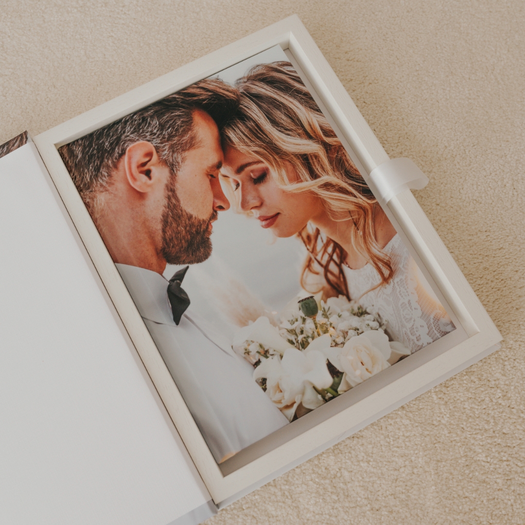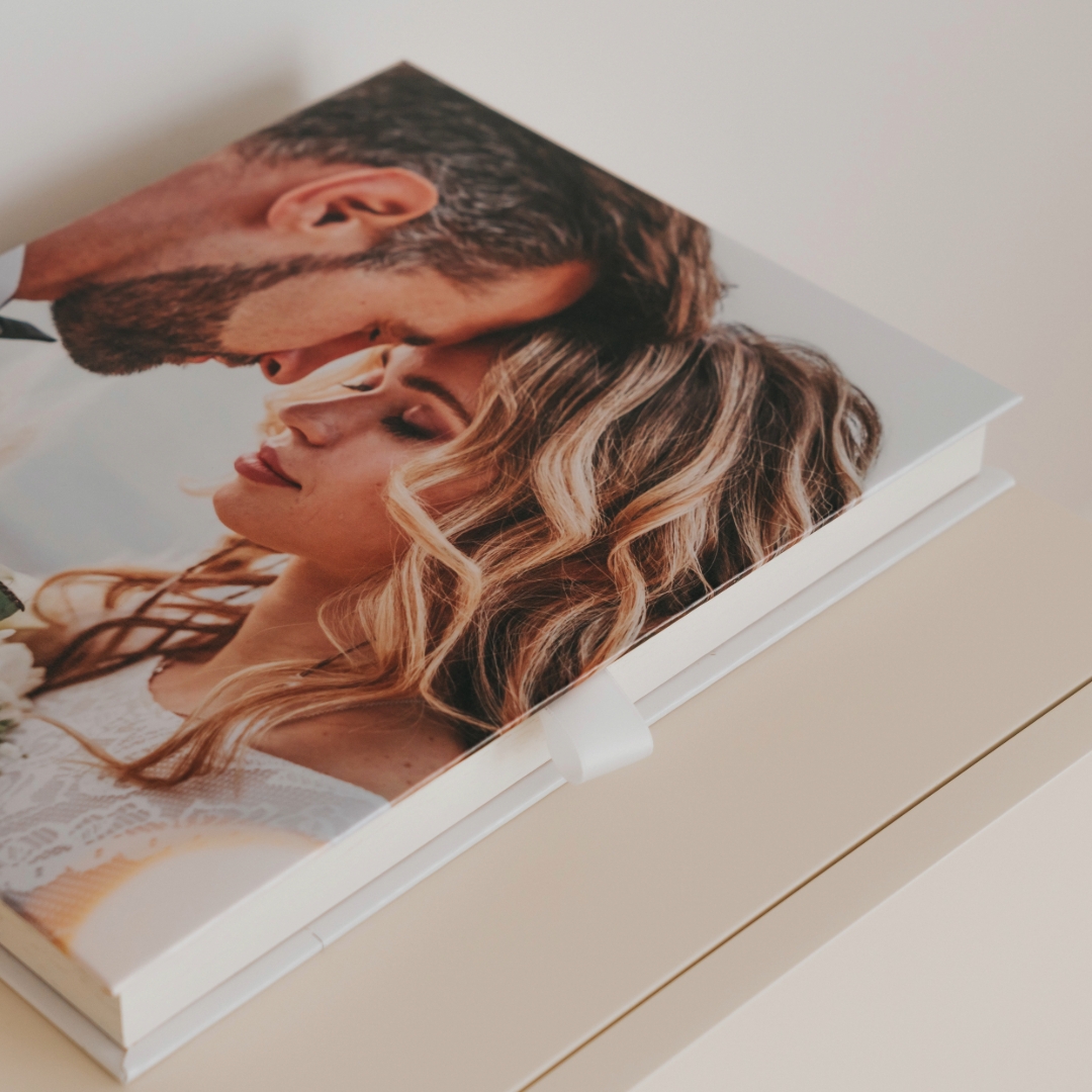 Uma box para guardar o álbum de casamento não só irá proteger o teu álbum de danos como também irá adicionar um toque especial na apresentação. Adiciona à box os vossos nomes, data do casamento ou até mesmo uma frase especial, tornando a tua box única e significativa.