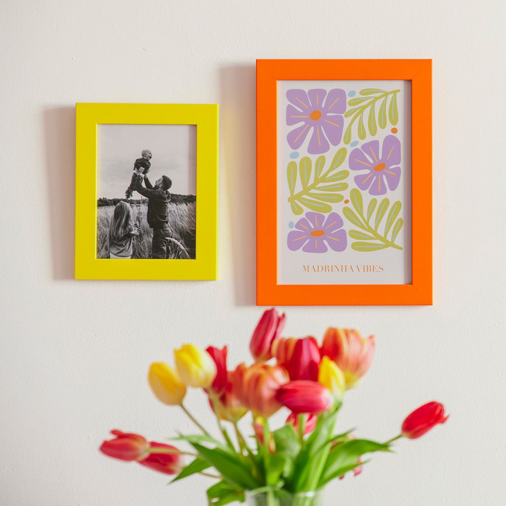 As Molduras de Parede Ejer trazem a energia da estação para a tua casa. Estão disponíveis em quatro tons vibrantes: Laranja, Amarelo, Verde e Violeta, perfeitas para criar composições alegres e modernas.